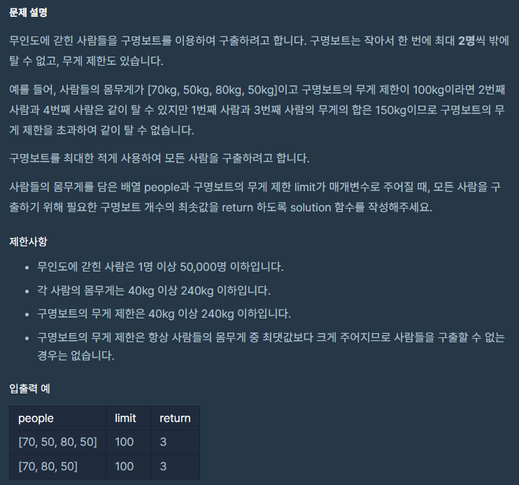 - queue에 남아 있는 사람들 중 가장 무거운 사람부터 반복문으로 비교하여, 무게 합이 limit을 넘지 않으면 그 사람을 queue에서 제거하고 보트에 태운다.