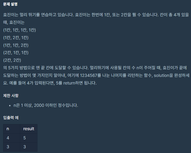- 위 경우가 모두 아니라면, dfs(steps+1)(한 칸 이동하기)과 dfs(steps+2)(두 칸 이동하기)의 결과를 더하여 memo[steps]에 저장하고 반환 - dfs(0)을 호출하여 0에서 시작해 모든 칸을 이동하는 방법의 결과를 반환한 후 1234567로 나눈 나머지를 구한다.