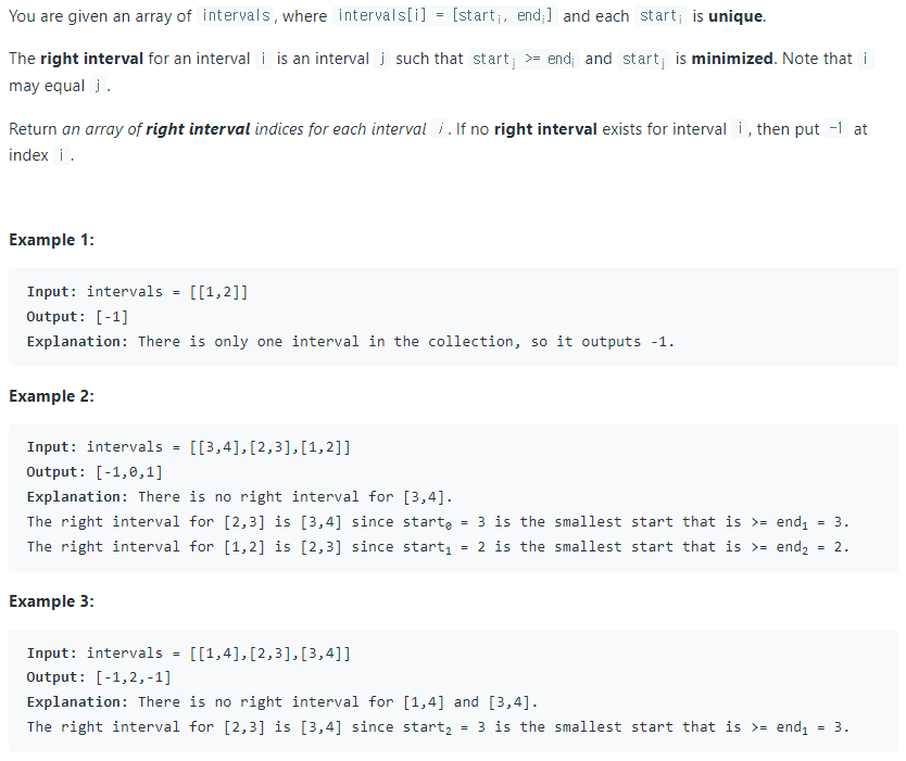 문제의 핵심은 각 구간(interval)의 끝 지점 이후에 시작하는 가장 가까운 구간(interval)의 인덱스를 찾는 것이다.